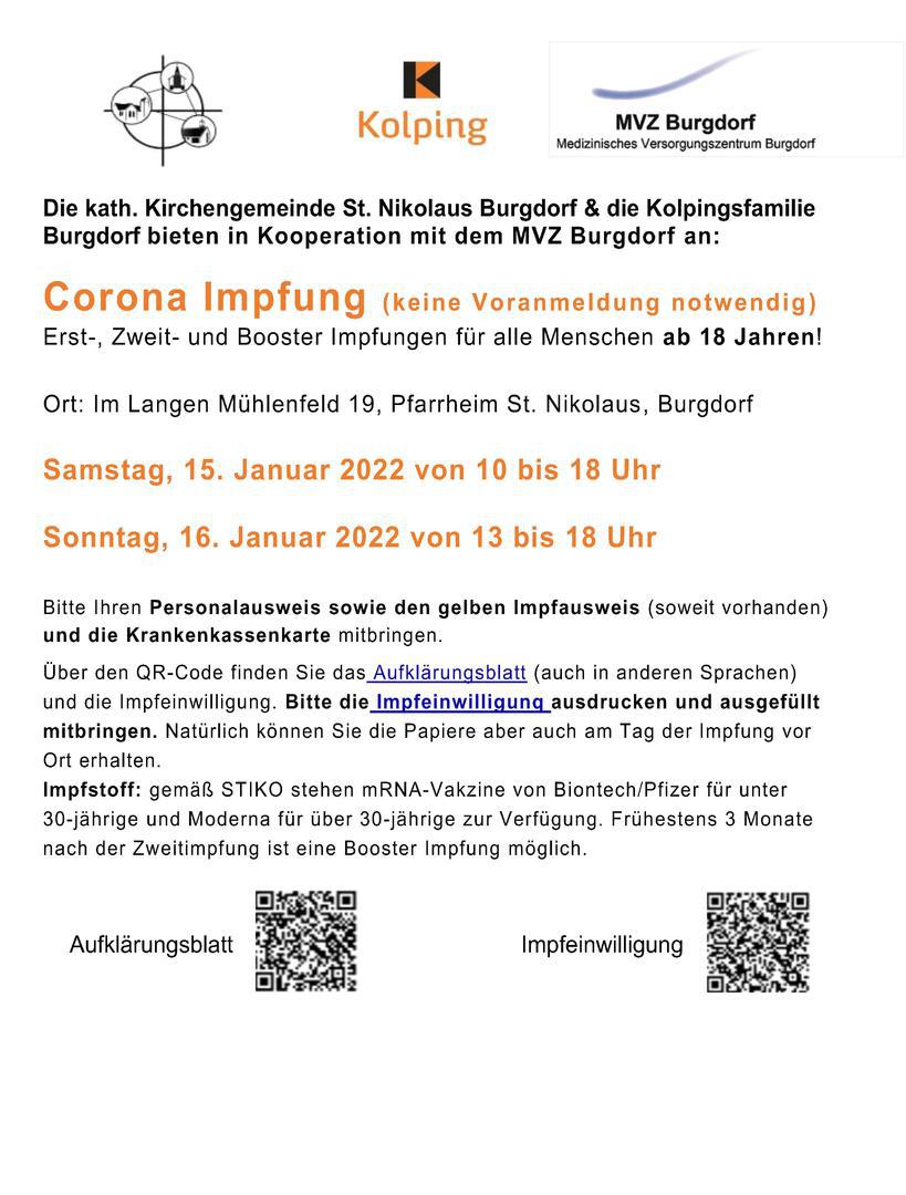 Versorgungszentrum bietet die katholische St.-Nikolaus-Gemeinde am Sonnabend, 15. Januar, von 10 bis 18 Uhr sowie am Sonntag, 16. Januar, vom 13 bis 18 Uhr eine Impfaktion für Erwachsene an, und zwar